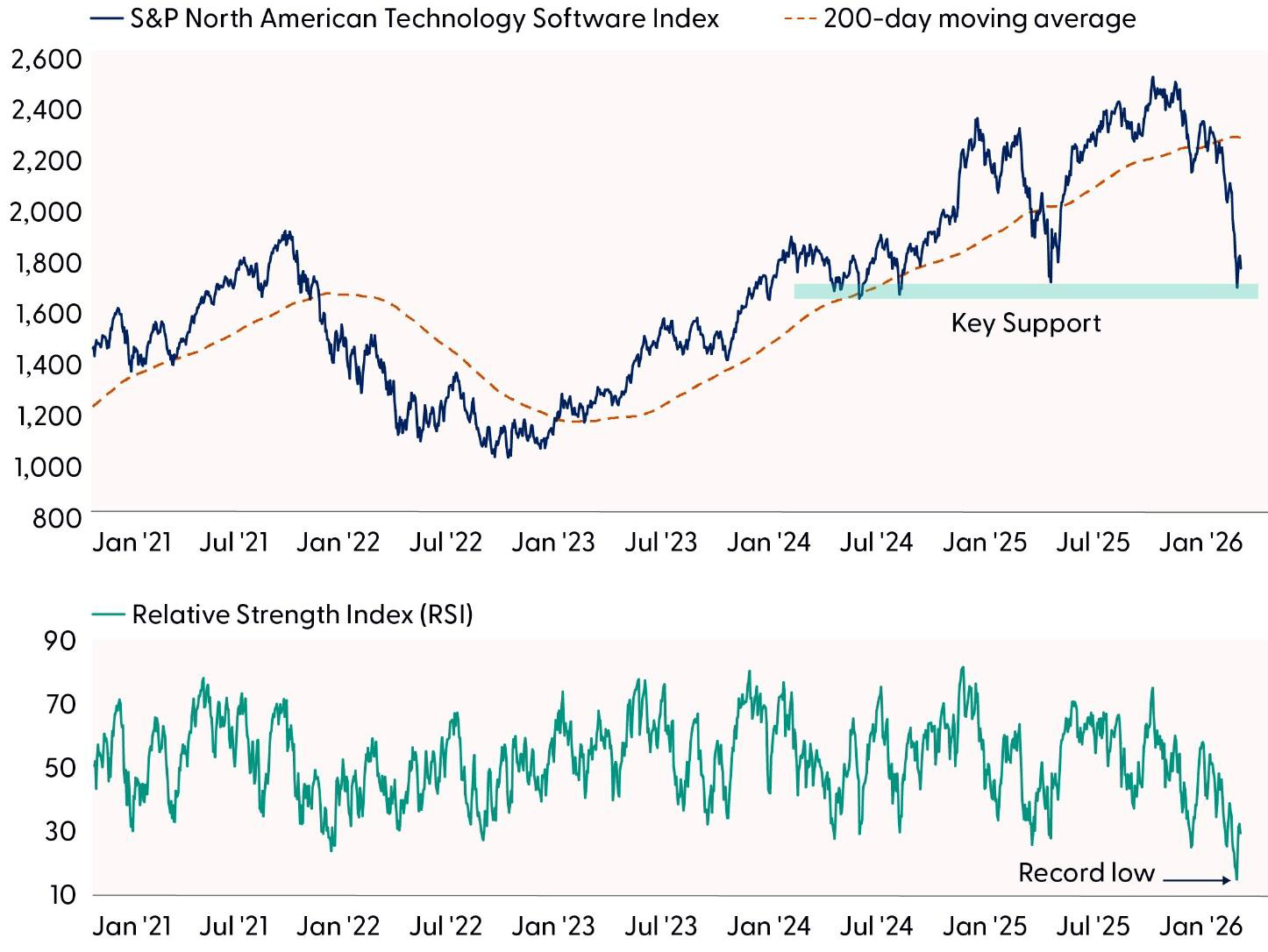 Selling pressure has been severe across the software sector. The S&P North American Technology Software Index is down over 20% on the year and currently sits just over 30% below its September record high. Sentiment couldn’t get much worse, and positioning has been mostly a one-way street of short selling. According to Commodity Futures Trading Commission (CFTC) data, asset managers sold around $3.6 billion of Nasdaq futures during the week ending February 3, marking the largest week of short positioning in 11 months. Momentum indicators also reached historically oversold levels, with the Relative Strength Index (RSI) — a momentum oscillator used to measure the velocity of price action to determine trend strength — on the S&P North American Technology Index falling to its lowest level on record.