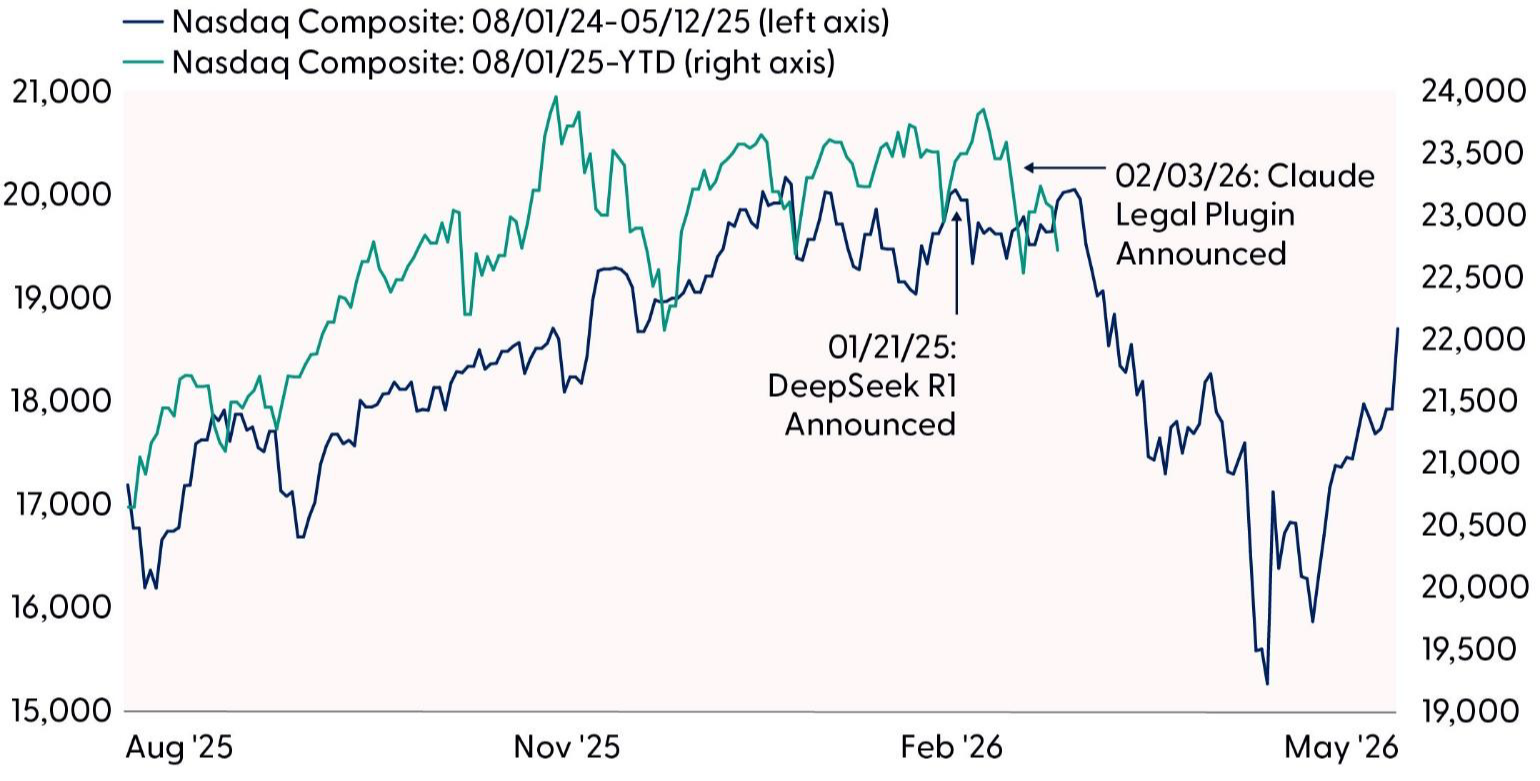 While today’s AI‑driven market turbulence echoes aspects of the DeepSeek episode, recent price action also mirrors last year’s setup in the Nasdaq Composite, where overbought conditions and fatigue in AI‑related enthusiasm set the stage for heightened volatility. DeepSeek’s announcement at the time added fuel to that backdrop, contributing to steep drawdowns — such as NVIDIA’s more than 20% decline in only a few weeks. But unlike last year, new tariff announcements extended the volatility into April, even as the longer‑term secular AI trend remained firmly intact.