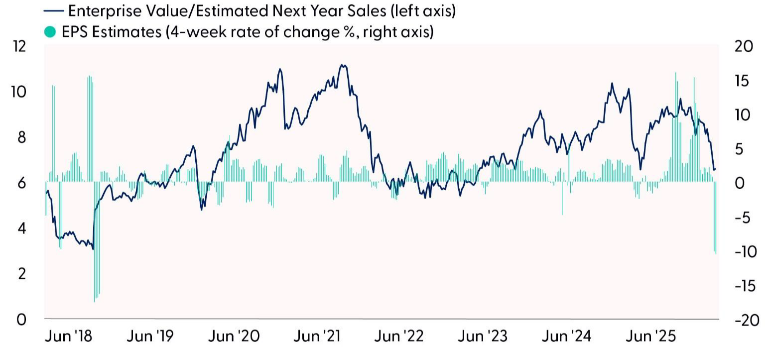 The drastic re-rating of software stocks has brought valuations to historically low levels. Full-year 2026 earnings per share (EPS) estimates for the S&P North American Technology Index have been cut by over 10% over the last four weeks, marking the largest rate of change since the Federal Reserve (Fed) induced market sell-off in December 2018. Even with the downward revisions, software is still expected to grow earnings this year by 25%, according to Bloomberg data. Operating margins are also expected to expand this year to 39% from 23% in 2025. The enterprise value to expected next year’s sales ratio (which measures a company’s current total value to projected revenue for the next 12 months), has dropped to only 6.6, the lowest level since April. While low valuations can sometimes signal deeper structural issues, we believe the recent re-rating may be overly punitive given the broader fundamental strength still evident across the software landscape.