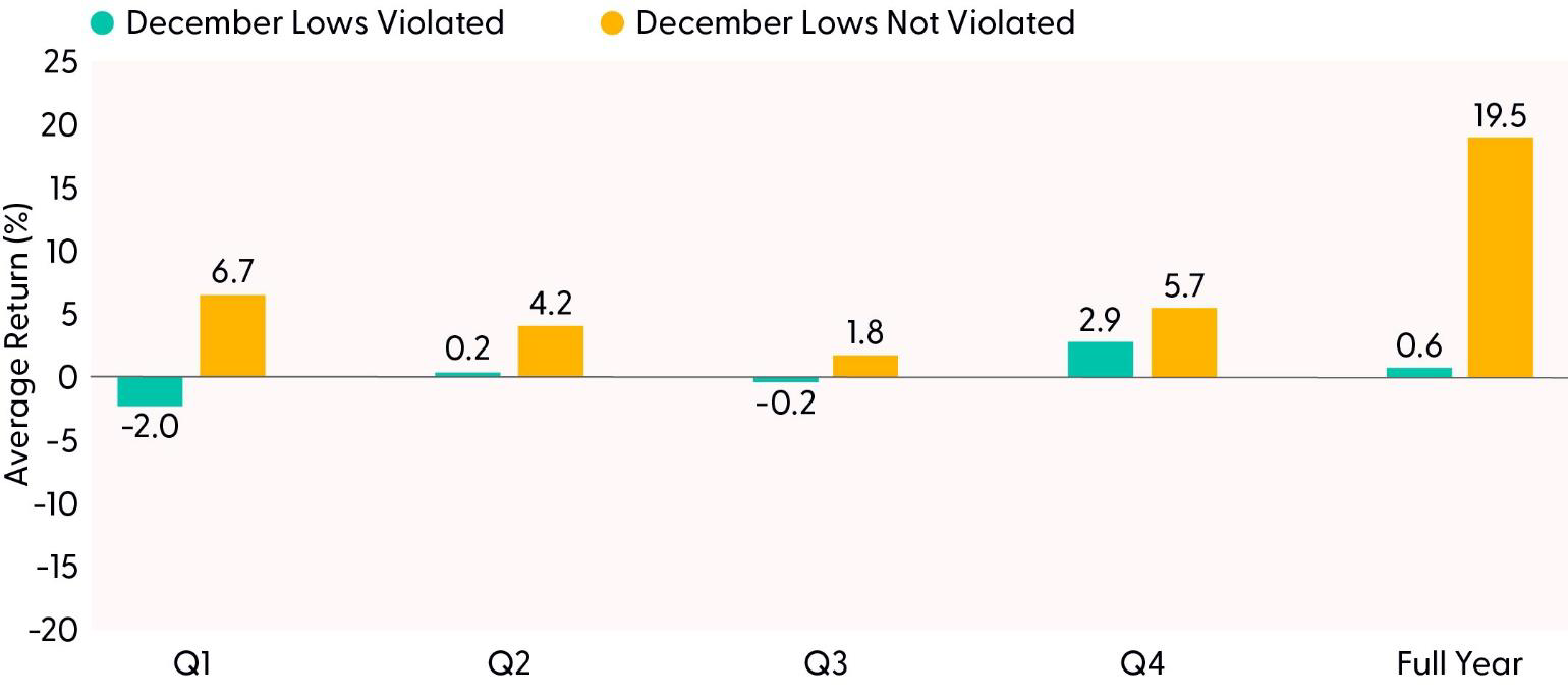 S&P 500 Returns if December Lows Fail or Hold in Q1 (1950–2025)