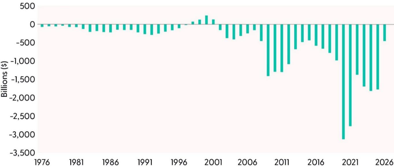 The Federal Reserve (Fed) enters 2026 navigating potentially constrained policy conditions as resilient growth and above‑trend inflation intersect with an increasingly unsustainable fiscal trajectory. Fed Chair Jerome Powell emphasized that federal debt growth requires eventual corrective action, even if near‑term market risks remain limited. Rising primary deficits at near full employment further limit long‑run policy flexibility, while expanding Treasury financing needs — and a growing reliance on short‑duration bills — heighten rollover risk and amplify sensitivity to the Fed’s policy rate.