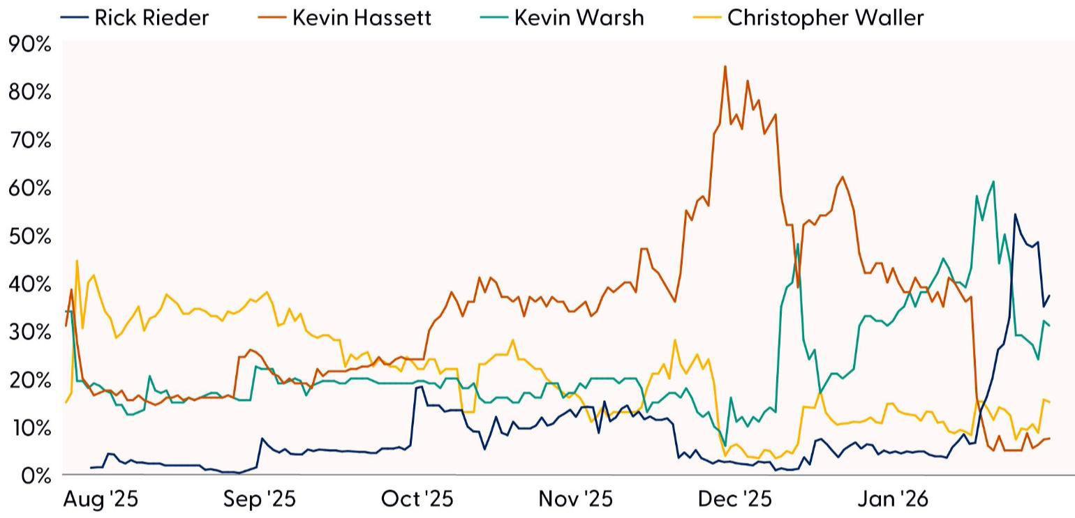 For much of this period, markets lacked clarity on which candidate would emerge as the frontrunner, with betting markets rotating among the four and elevating each as the favorite at various points over the past six months. Ultimately, the uncertainty resolved only at the end of the process, when President Trump nominated Kevin Warsh for the role — confirming what had previously been only one of several plausible outcomes.