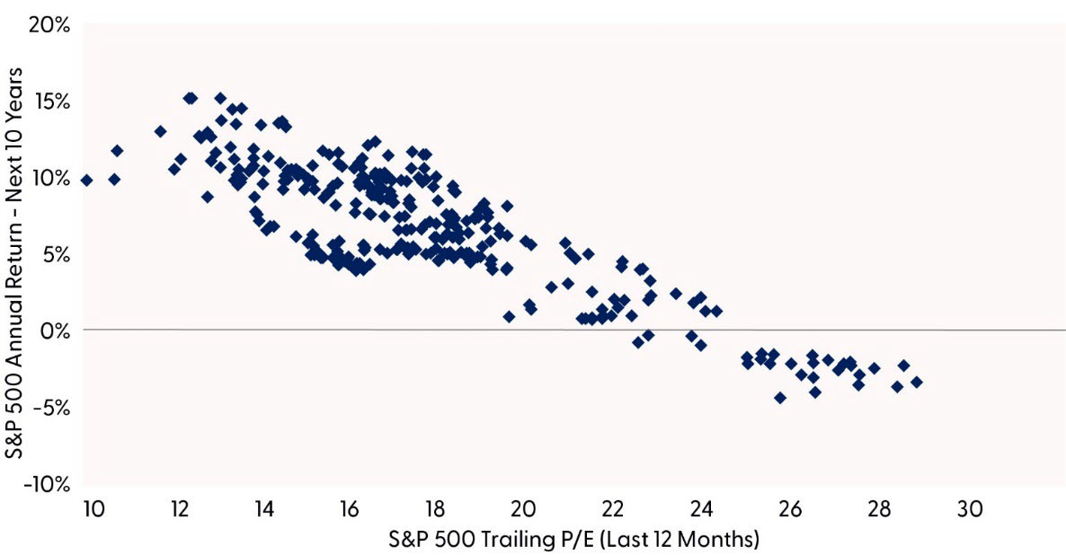 Valuations play a particularly critical role in our strategic framework, as historically they have demonstrated a high correlation with long-term market performance. The price-to-earnings ratio (P/E) for the S&P 500 Index, for example, has shown predictive power for subsequent decade-long returns, with higher P/Es typically preceding weaker long-term performance and lower P/Es often followed by stronger results. This relationship between starting valuations and subsequent returns supports patience and informs how we size risk exposure and tilt across styles within the SAA context.