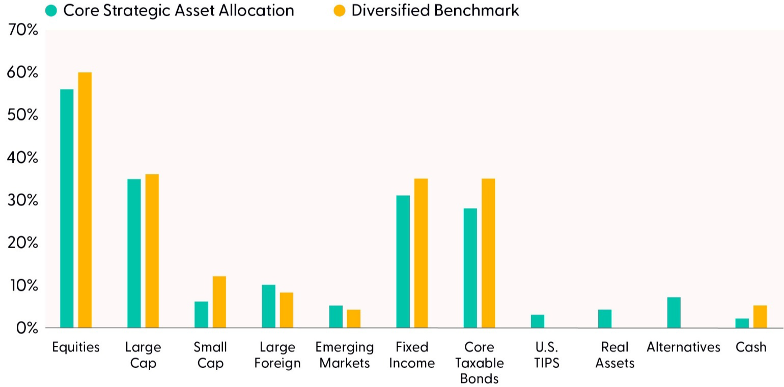Within the 2026 SAA, we retain meaningful equity exposure but keep it modestly below benchmark exposure levels. We increase U.S. large-value and developed international equities where starting valuations, income, and stability characteristics strengthen the long-run strategic investment case. We trim small cap equities to balance return potential with volatility, acknowledging a tighter risk-reward today, but we still believe in their role over full market cycles and keep a material overweight relative to a purely global market cap baseline. Reducing small caps modestly allows the portfolio to benefit from their long-term potential while avoiding excess volatility during periods when quality and income characteristics in larger-cap markets seem more compelling. The result in this vintage of the SAA is a steadier mix of equities that relies less on a narrow set of increasingly concentrated outcomes and more on diversified drivers of return.