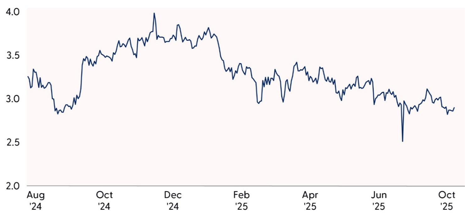 While falling yields and the prospect of further rate cuts have buoyed equity markets, they also raise concerns about how much lower yields can go before signaling deeper economic trouble. Treasury yields reflect expectations for growth and inflation, so a continued downtrend in rates would likely require further signs of economic deceleration and easing price pressures. With the labor market already nearing stall speed, the scope for additional downside in yields may be limited before recession fears begin to resurface.