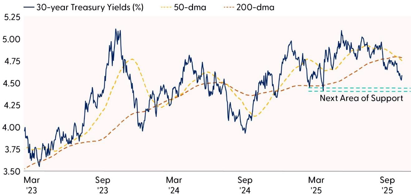 Technically, the path of least resistance for rates remains lower. Yields on 2-, 10-, and 30-year Treasuries are entrenched in accelerating downtrends. As shown in the “Long Bond Yields Breakdown to Multi-month Lows” chart, the 30-year yield recently broke below both its September lows and a key uptrend, leaving 4.42% and 4.30% as the major areas of support.